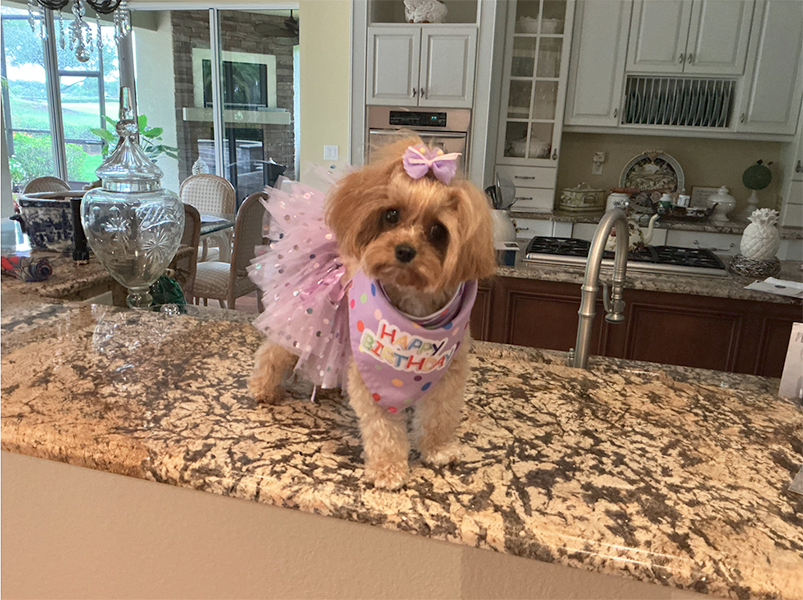 However she turned out to be very tiny, only weighing 6 pounds while most Cavapoos can be in their teens in weight. Her favorite pastime is chasing her toys while Mom continuously throws them until she wears out. That is, of course, Mom who wears out! She has learned to sit, dance, touch, down, stay, but she is best at tugging at her Mom’s heart. She LOVES all people and wants anyone and everyone to pet her. Lillybelle also has a favorite lizard she greets each day by the drainpipe! If you see us out walking please come say hi and give her a pat.