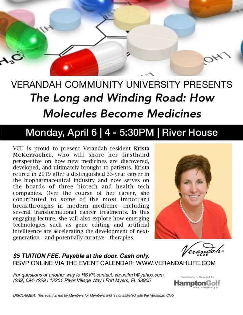 Verandah Community University is a member-run organization that presents an educational/entertaining program one Monday per month from October to April. The programs are held in the River House Dining Room from 4-5:30 p.m., with a cash bar available.